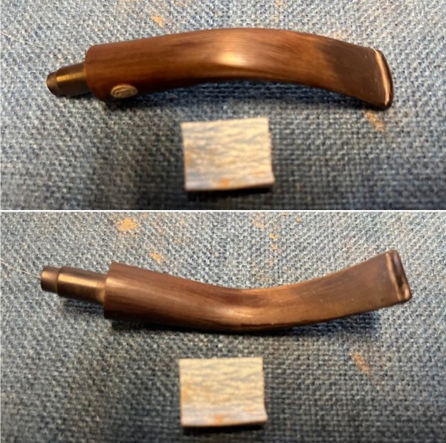 I took photos of the rim top and bowl as well as the stem to give a sense of the condition of both. The faux plateau rim top and the inner edge had some darkening and burn damage on the inner edge on the back of the bowl. The bowl is slightly oval and out of round. The stem was clean but had light tooth marks and chatter on the top and underside ahead of the button.