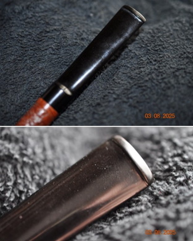 I sanded the repairs with 220 grit sandpaper to smooth them out. I sanded the end of the saddle and fitted it with a thin brass band. I thinned the depth of the band with a topping board to reduce the profile so that it would not cover the briar dot on the top of the saddle. It would function as an external band to hold the repairs tight while I drilled the airway for the new tenon. I coated the inside of the band with white glue and pressed it on the stem.