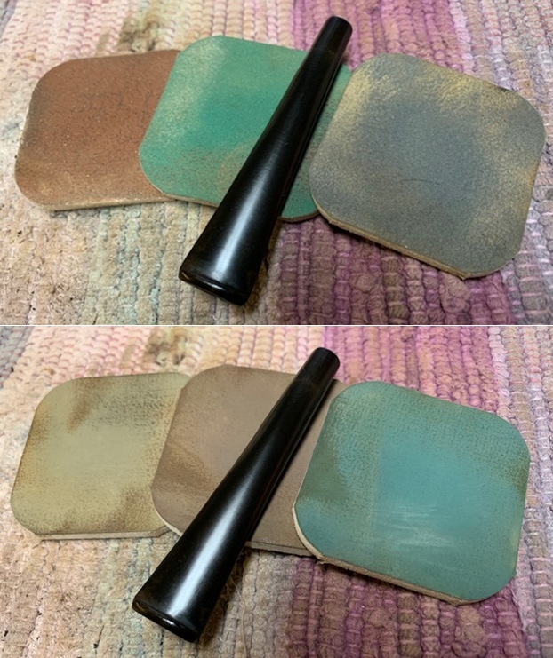 The last two pictures show the completion of the button shaping upper then lower, using 240 grit paper followed by 600 grit paper and 0000 grade steel wool to catch the button repair area with the rest of the stem. The button rebuild looks great and the hole patch is blending well.