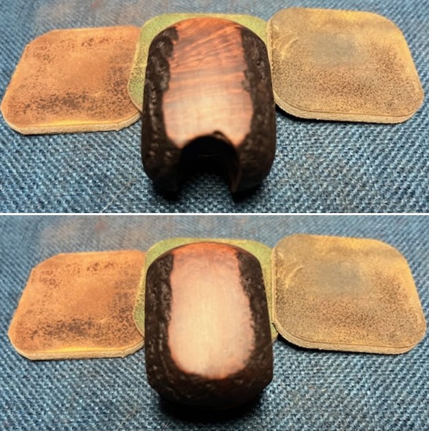 I sanded the surface of the acrylic taper stem with the 2 x 2-inch sanding pads – 320-3500 grit pads to clean up the sanding marks on the stem surface. By the final 3500 grit pad the stem started to really shine. The repairs are visible but they are smooth. It is hard to patch Cumberland style stems.