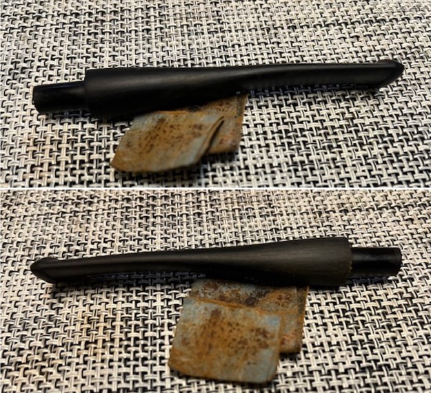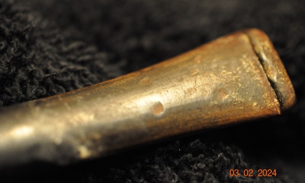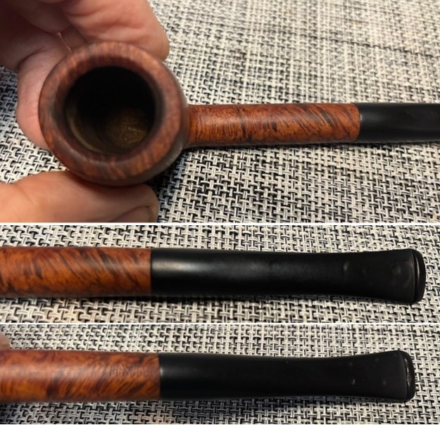 I took a photo of the rim top to show the condition. You can see the clean bowl. The bowl is in excellent condition and is clean. The rim top and the inner edge had a few issues. The top had some pitting and nicks and the inner edge had some burn damage toward the front of the bowl. The stem came out looking clean. There were some tooth marks and chatter on both sides.