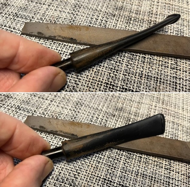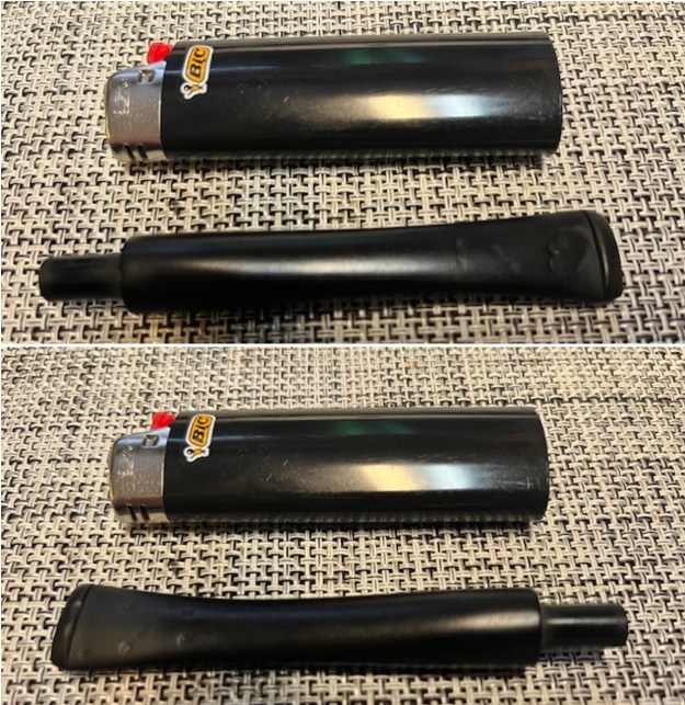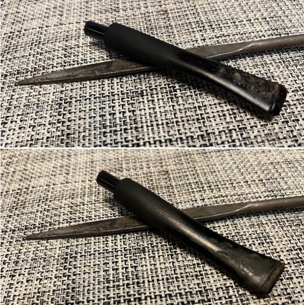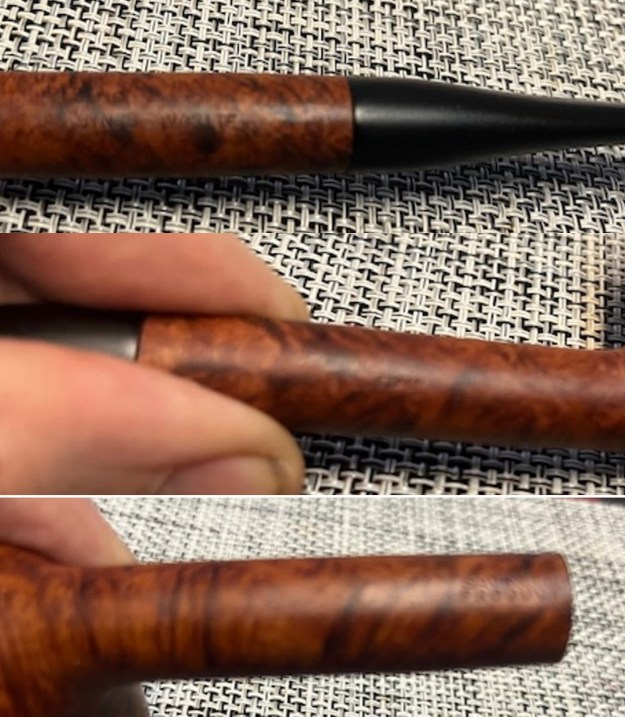 I set the bowl aside and turned my attention to the stem. I “painted” the surface of the stem with the flame of a Bic lighter to lift the tooth marks. I was able to lift many of the marks significantly. I filled in what remained with black CA glue (rubberized and carbonized). It is a great product that has some elasticity and cures hard but not brittle. Once it cured I used a flat file to smooth out the repairs. I finished blending them in with 220 grit sandpaper.