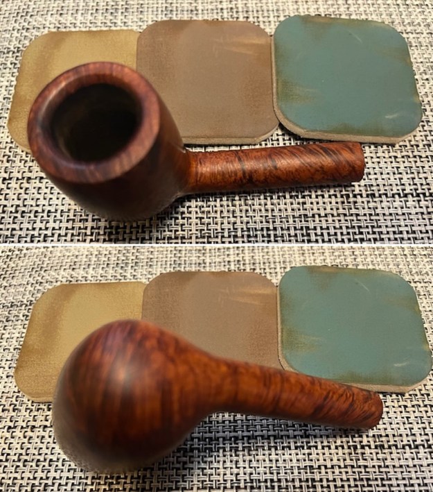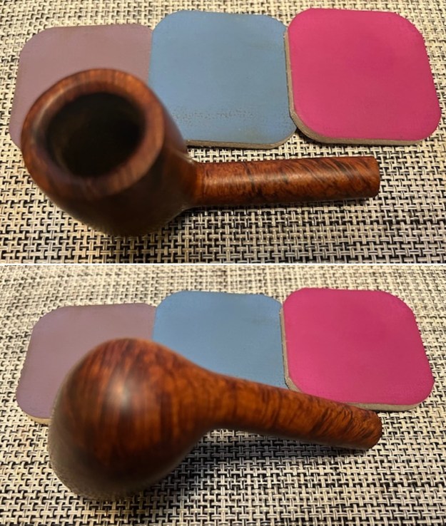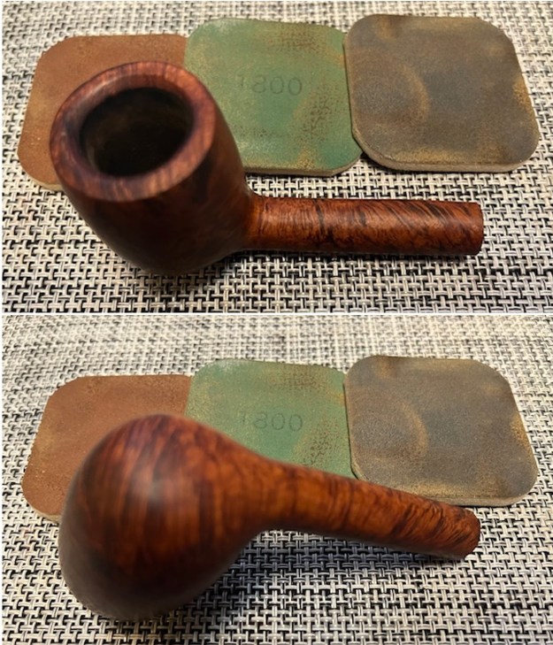 The top looked better. The bowl is a little out of round but it is much better. I sanded the surface of the bowl and rim top with 320-3500 grit sanding pads. They well to remove the surface scratches and nicks in the briar. I wiped it down after each sanding pad with a damp cloth.