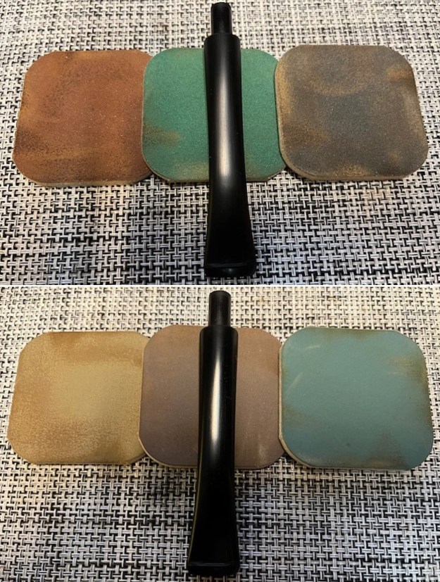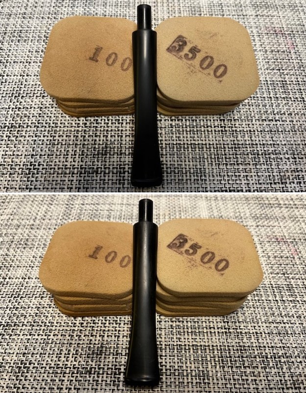 I moved on to further smooth out the surface of the repairs to the vulcanite. I sanded them smooth with 320-3500 grit sanding pads to further blend them into the surface of the stem.