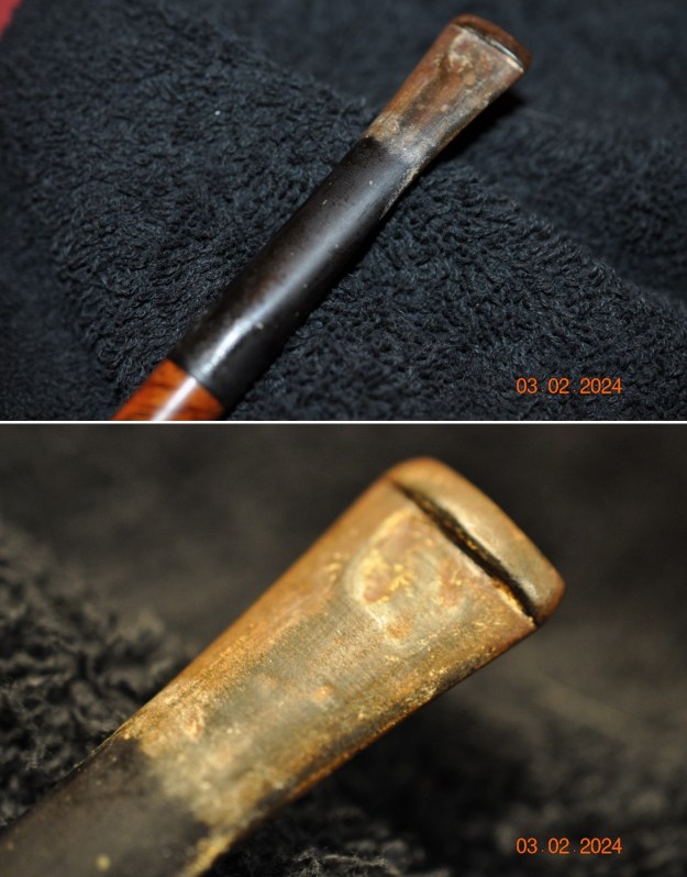 Jeff took photos of the stem surfaces and the bowl and rim to give a sense of condition of the pipe. You can see the thick cake in bowl and the lava overflow on the edges and rim top of the bowl. It is hard to know if there is any damage as the cake and lava is quite thick. The stem surface is very dirty and you can see the area on the end of the stem where the Softee Bit had protected it from chewing though there were some previous deep tooth marks covered by the dirt and debris.