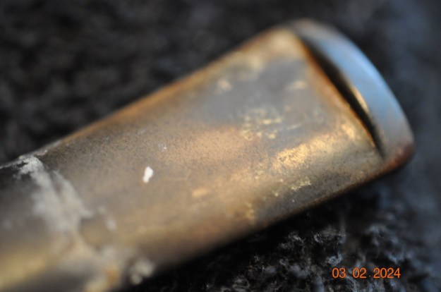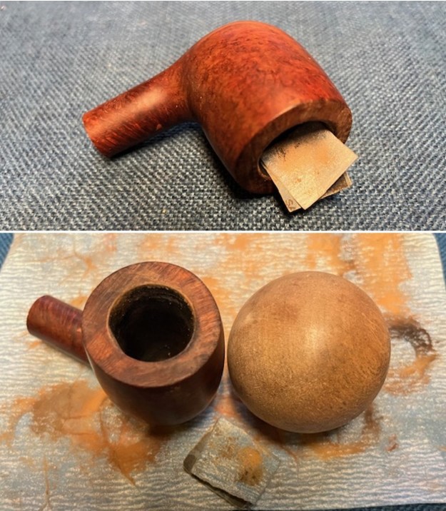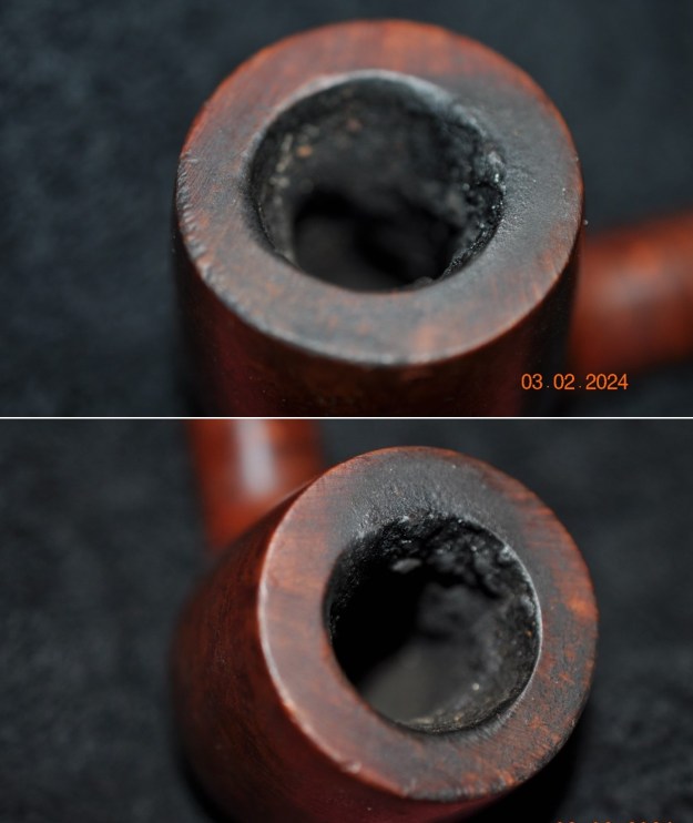 I took a photo of the rim top to show the condition. You can see the clean bowl. The bowl is in excellent condition and is clean. The rim top and the inner edge had a few issues. The top had some pitting and nicks and the inner edge had some burn damage toward the front of the bowl. The stem came out looking clean. There were some tooth marks and chatter on both sides.
