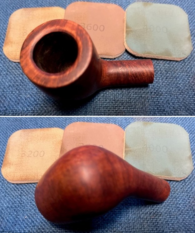 The top looked better. The bowl is a little out of round but it is much better. I sanded the surface of the bowl and rim top with 320-3500 grit sanding pads. They well to remove the surface scratches and nicks in the briar. I wiped it down after each sanding pad with a damp cloth.
