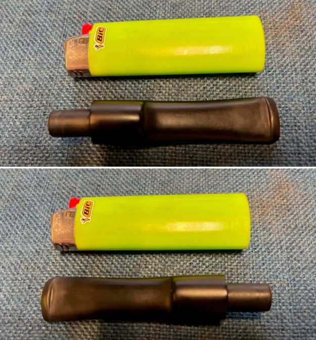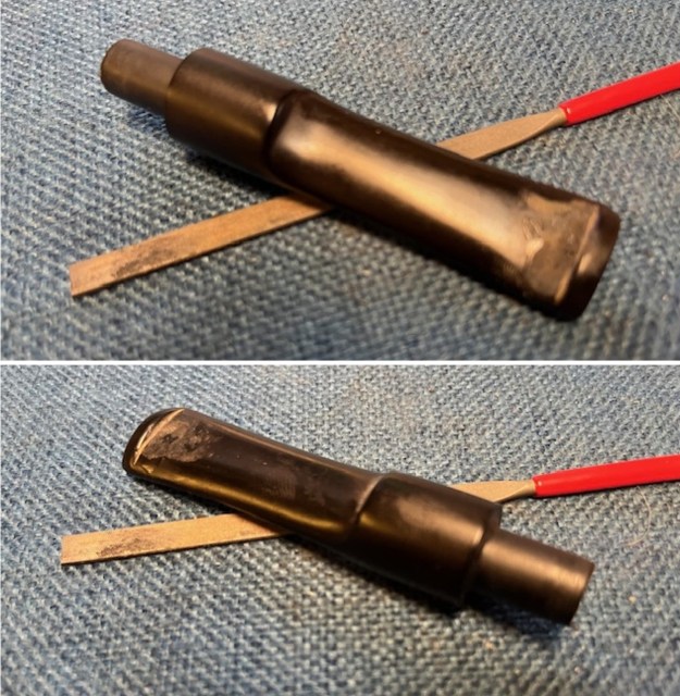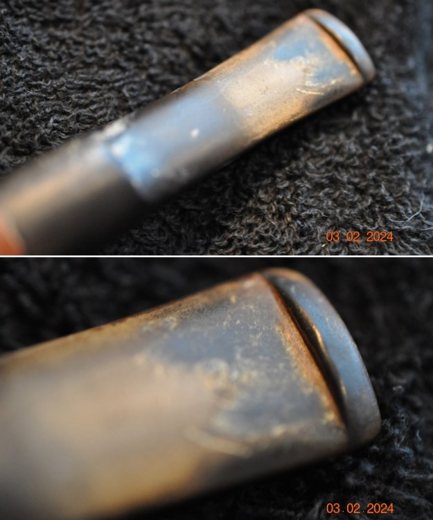 I set the bowl aside and turned my attention to the stem. I “painted” the surface of the stem with the flame of a Bic lighter to lift the tooth marks. I was able to lift many of the marks significantly. I filled in what remained with black CA glue (rubberized and carbonized). It is a great product that has some elasticity and cures hard but not brittle. Once it cured I used a flat file to smooth out the repairs. I finished blending them in with 220 grit sandpaper.