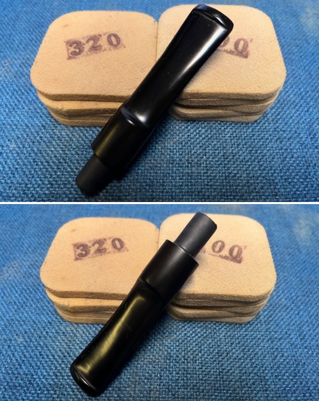 I moved on to further smooth out the surface of the repairs to the vulcanite. I sanded them smooth with 320-3500 grit sanding pads to further blend them into the surface of the stem.