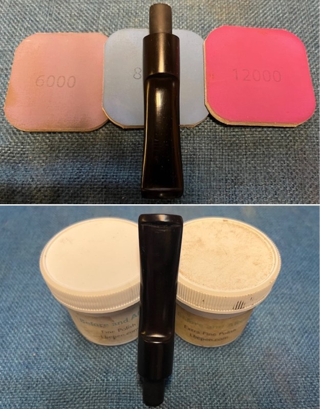 I polished the vulcanite with micromesh sanding pads – 1500-12000 grit pads. I wiped it down with Obsidian Oil after each sanding pad. I used Before & After Pipe Polish – both Fine and Extra Fine to further polish the stem. It really took on a shine and I knew that once it was buffed it would look amazing.