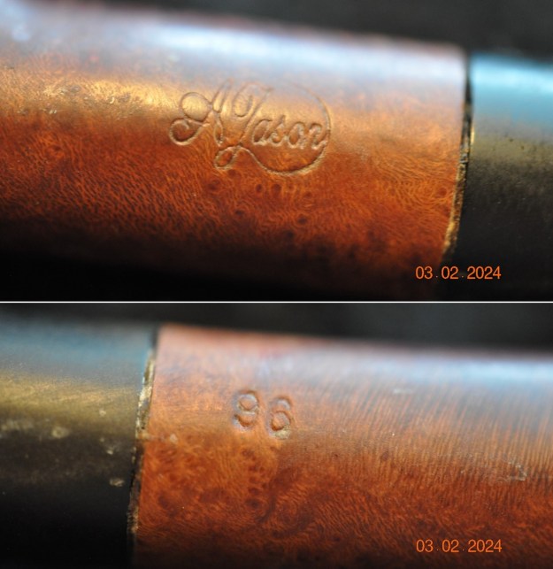Jeff went to the house and looked through the racks, pipe bags, tobacco both bulk and tinned as well as a variety of pipes. All the pipes were well smoked and needed serious cleaning. Another one of the pipes he picked up was this A. Jason Billiard with a well fitting vulcanite saddle stem. It was very dirty and was a reddish, brown coloured pipe when it started. The smooth finish around the bowl was dirty and had hand oils ground into the grooves. The bowl had a thick cake that overflowed in lava onto the rim edge and top of the bowl. The stem was vulcanite that was very dirty and had the marks of a rubber Softee Bit on the end. It was also a very dirty 9mm filter stem. It had become discoloured and there was a line where the debris from smoking had accumulated along the edge and under the bit protector. The good news was that there were some deep tooth marks and chatter under the calcification and grime. The rest of the stem was dirty and had lost the characteristic shine. The pipe was stamped on the left side of the shank and read A. Jason in script in an oval. On the underside of the shank it is stamped with the shape number 96. Jeff took photos of the pipe so I could have a sense of what it looked like before he started his work on it.
