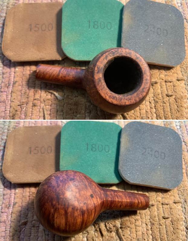 I filled in the flaws in the bottom of the bowl and left side with clear CA glue. Once it cured I sanded the spots smooth with 220 grit sandpaper to blend it into the surface of the briar.