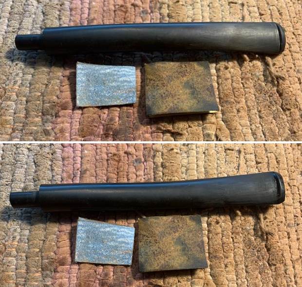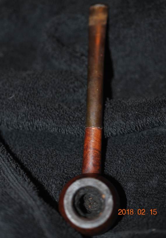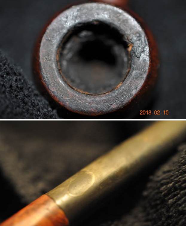 He captured the cake in the bowl and the debris and lava on the rim top and edges in the next photos. It was very clear that it was another exceptional smoker! The stem is oxidized, calcified and shows the tooth marks and chatter on both sides ahead of the button. There is an oval shaped mark on the top of the stem in the photos. It appears that there was a decal of something on the top of the stem that had long since disappeared.