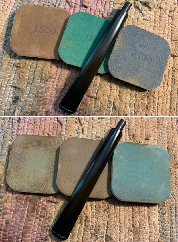I set the bowl aside and turned my attention to the stem. I “painted” the tooth marks with the flame of a lighter and was able to lift all of them. I sanded out the remaining chatter with a folded piece of 220 grit sandpaper and then started polishing it with 400 grit wet dry sandpaper.