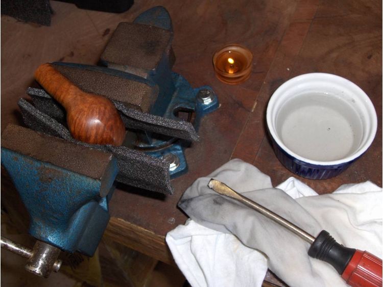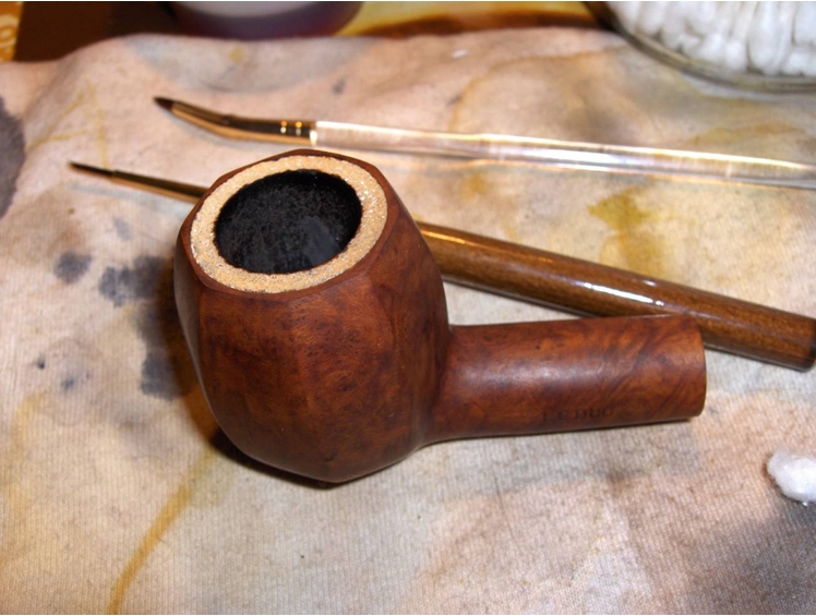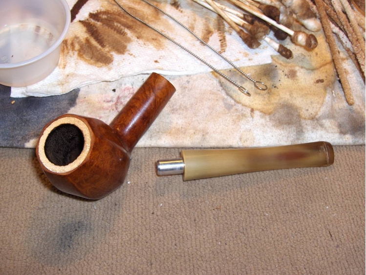 I extended my work time for a while and cleaned out the shank internals. I cleaned the shank walls by scrubbing it with shank brushes and anti-oil dish washing soap while being careful around the cork! The bowl is now clean and fresh. I set the bowl aside to dry under a heat lamp.