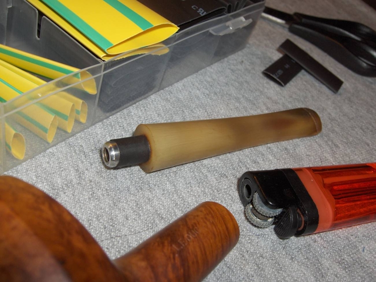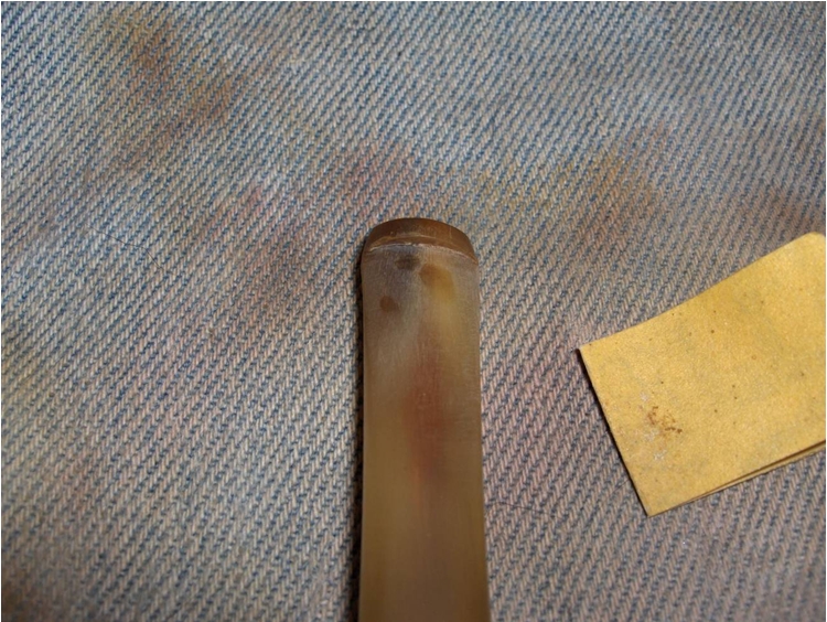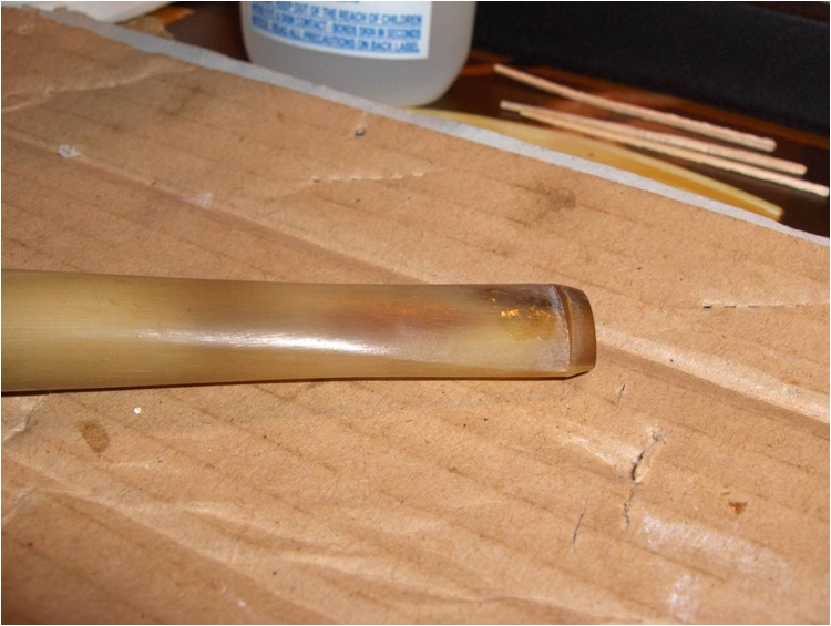 Next, I cleaned the copper ferrule at the shank end with “Pitambari”, a powder that is available all across India that is used to clean and shine brass, copper and silver ware. This compound is a very fine powder and is least abrasive with fantastic results. The band is now a nice shining piece and will provide a nice contrast between the shining horn stem and the dark brown stummel. I attached the band at the shank end with all-purpose glue.