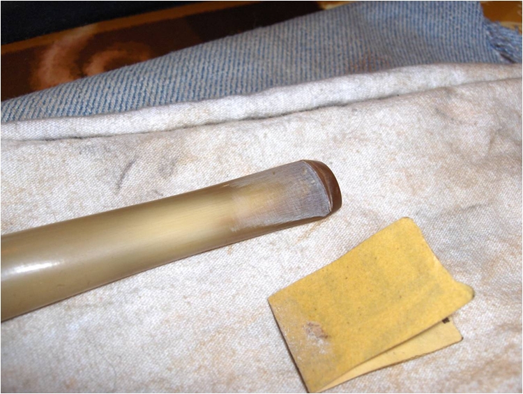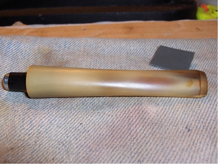 I set the stummel aside and worked on the stem repairs next. The repairs had completely hardened and all that needed to be done was to blend in these repairs with the rest of the stem surface. I began by sanding the fills with a flat needle file to achieve a rough match followed by sanding the entire stem with a worn folded piece of 180 grit sandpaper. The button edges were also evened out and sharpened during the process. The fills will be further blended during the polishing cycle using various grit sandpapers and micromesh pads. I applied a generous layer of EVO and massaged it in to the horn stem to hydrate it and set it aside for the oil to be absorbed into the horn.