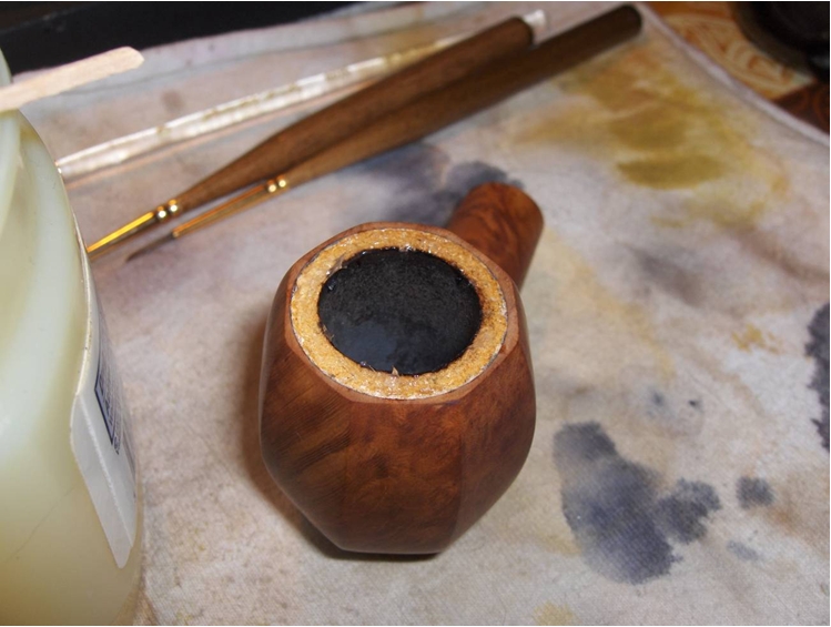 The next evening with the stummel now dry and the stem repairs completely cured, I had the option of either working on the stummel or the stem. There was this small step that was needed to address the fill that required to be refreshed and that is where I began. With sharp dental tool, I removed the old fill and cleaned the area with alcohol. Next, I mixed briar dust with CA superglue to form putty and applied this mix over the area to be filled. I set the stummel aside for an hour or so for the mix to harden, which is almost instantaneous over the surface.