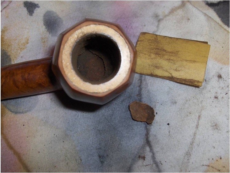 While I was handling the bowl, the copper band at the shank end came loose and it was then that I saw the cork lining along the walls of the mortise that was in place to ensure a snug fit of the long bone tenon in to the mortise. This cork lining has dried and needs to be revitalized. This lining also means that I would have to be careful while I clean the mortise so as not to erode and break the cork thus disturbing the seating of the stem.