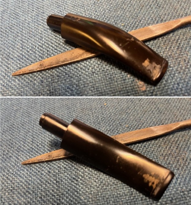 I filled in the tooth marks on the top and the underside of the acrylic stem with black CA glue. Once the repairs cured I used a file to flatten them into the surface. I sanded it with 220 grit sandpaper.