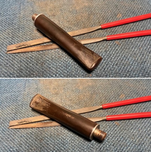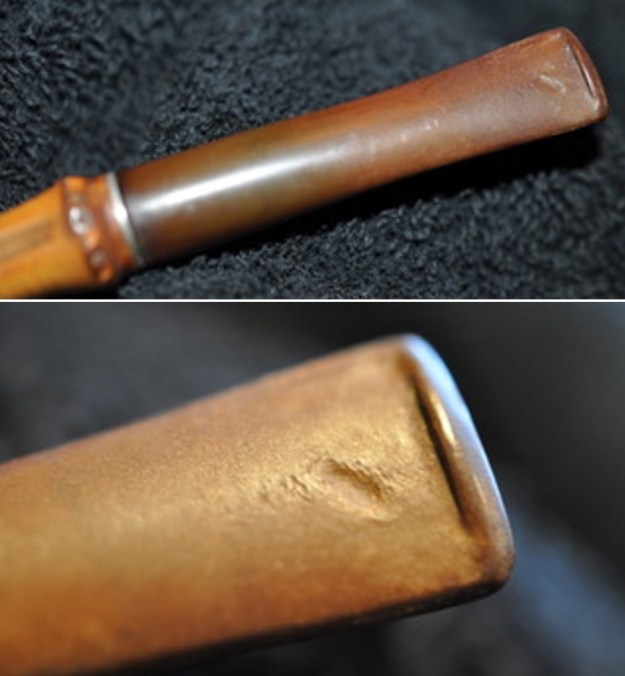 I touched up the P stamp on the left side of the stem with white acrylic fingernail polish. I worked it into the P stamp with a tooth pick. Once it dried I scraped off the excess of the acrylic with my fingernail. I sanded the stem area with a worn 1500 grit micromesh sanding pad. It looked very good.