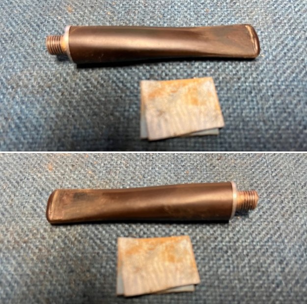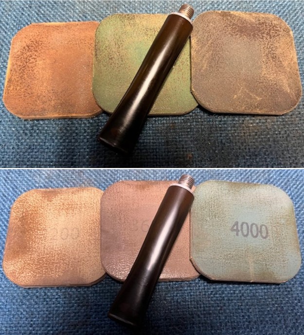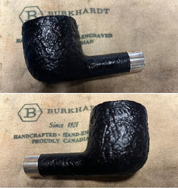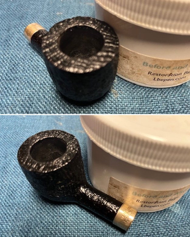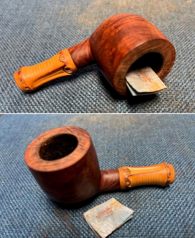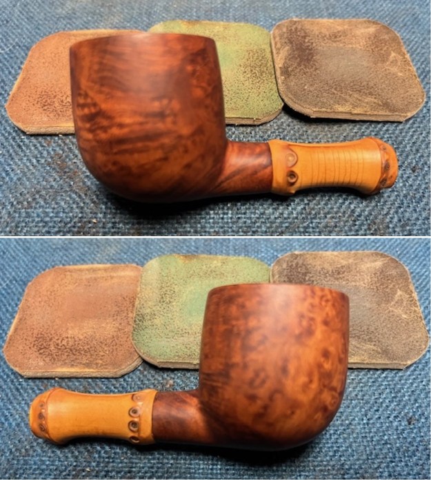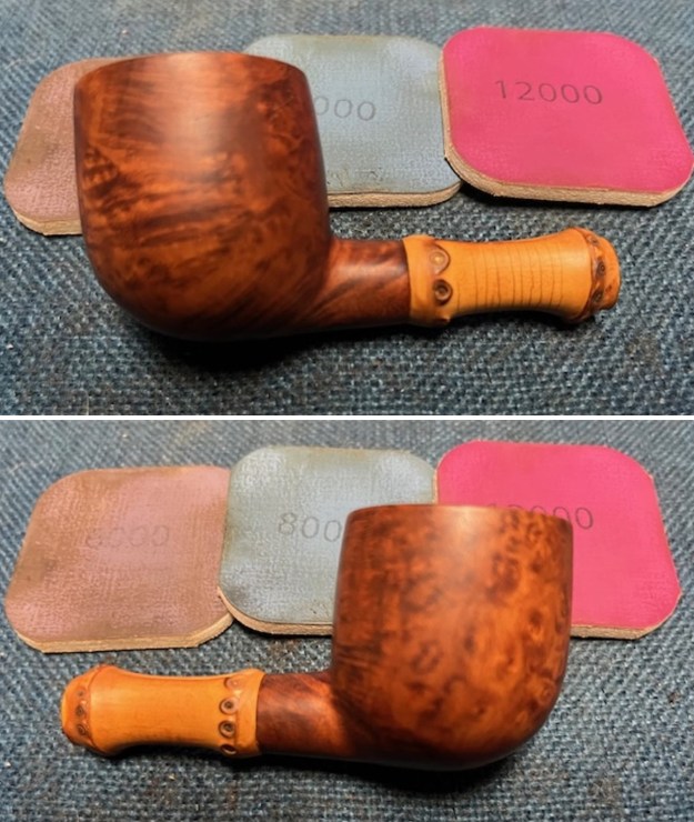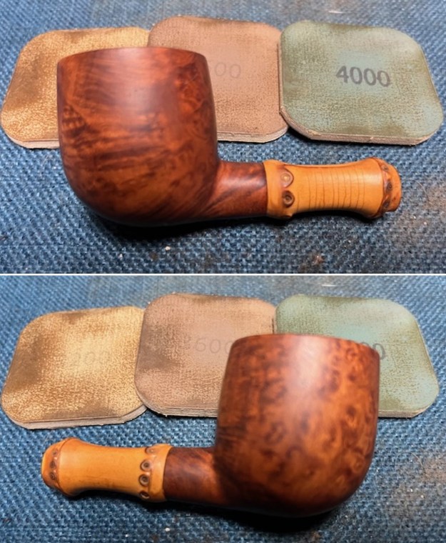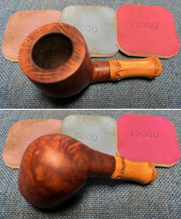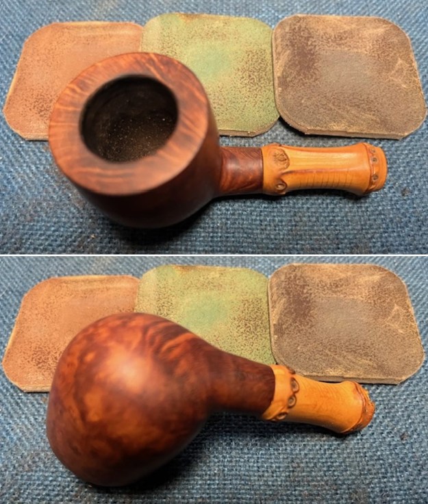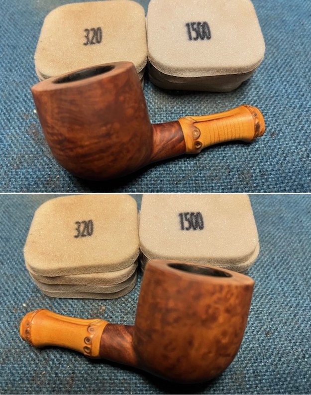 I sanded the briar with 320-3500 grit 2×2 inch sanding pads to remove the scratches and marks in the finish. I wiped the bowl down with a damp cloth after each sanding pad to remove the sanding debris. It really looks much better.