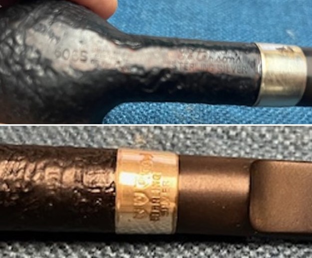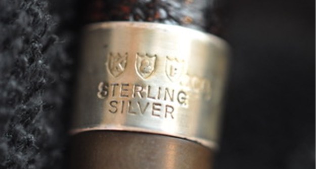 Sterling (1949-c1957; 1978-) – Higher grade line with sterling band. Early example, 1949-57, with COM of Made in Ireland forming a circle, were offered to the US market through Rogers Imports and have no hallmark, although until recent years the line carried Peterson’s maker’s mark, the K&P is in separate shields. Models beginning in ’78 with hallmarked dates and a COM stamp of Made in [over] the Republic [over] of Ireland.