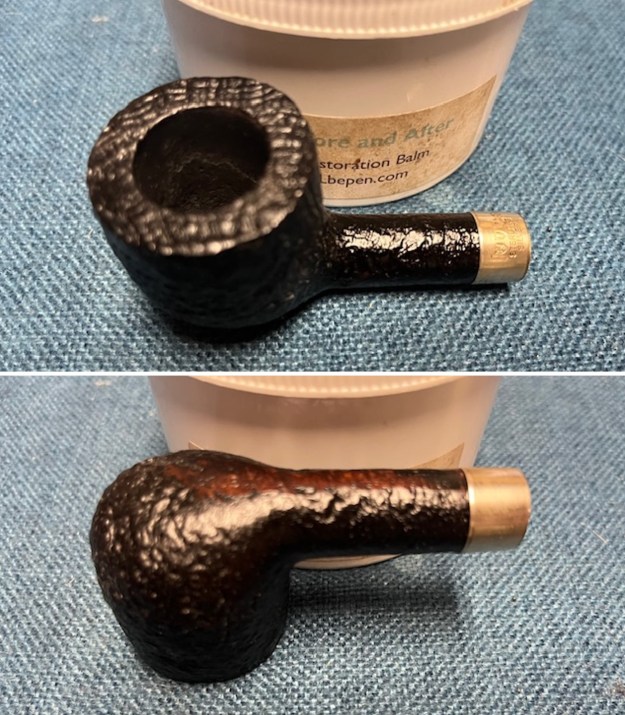 Jeff had done a great job cleaning up the pipe as usual. He reamed the pipe with a PipNet reamer and cut back the cake back to the bare briar. He cleaned up the walls with a Savinelli Fitsall Pipe Knife. He scrubbed the interior of the bowl and shank with pipe cleaners, shank brushes, cotton swabs and alcohol to remove the tars and oils. He scrubbed the exterior of the pipe with undiluted Murphy’s Oil Soap and a tooth brush to remove the grime from the finish. He worked on the rim top lava with the soap and tooth brush. He scrubbed the inside of the stem with alcohol, shank brushes and pipe cleaners. He scrubbed the exterior with Soft Scrub and then soaked it in Briarville’s Pipe Stem Deoxidizer. He washed it off with warm water to remove the deoxidizer. The pipe looked very good when it arrived here.