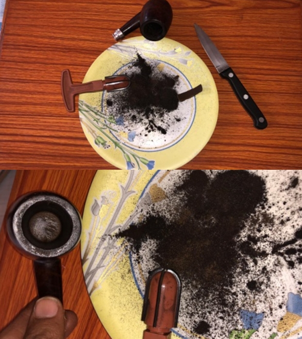 Well, even before I could start my initial visual inspection, I faced the first of the many numerous hurdles that I had to overcome during the restoration of this pipe. The shank extension and the stem would not budge even a millimeter to separate from the shank and the bone extension respectively. I remembered Mr. Steve referring to the technique of freezing the stuck parts in the freezer for a couple of hours for easy separation. I followed his advice and had to put the complete pipe in the freezer for a couple of hours as it could not be dismantled. True enough, the horn stem separated from the shank extension with the application of a little force, but the extension would not budge from the shank!!!! So I went back to Mr. Steve to tap in to his wealth of knowledge and experience. He suggested that I should apply the method of “Hot and Cold” shock treatment in which you gently and carefully heat the stuck part using a heat gun and then get it back in to the freezer. This process may need to be repeated a number of times before the parts separate. Well, I did exactly that, albeit heating with a hair dryer as I did not have a heat gun, and after 3/4 attempts, the extension finally separated from the shank!!!!