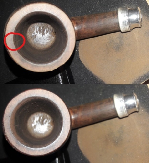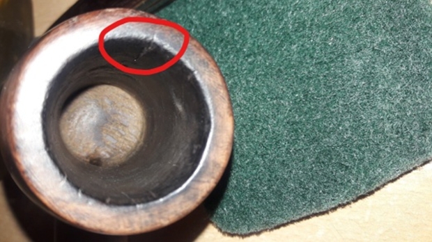 Once the cake was reamed back to the bare briar, I used a 150 grit sand paper followed by 220 grit sand paper to remove all the traces of remaining cake and also to smooth the inner walls of the chamber surface. Finally, to remove the carbon dust, I wipe the chamber with a cotton pad wetted with isopropyl 99%. I gently scrapped the rim top surface with a sharp knife. Removing all the cake from the chamber and rim top revealed that firstly, the rim was out of round and secondly was a web of fissures along the internal walls. There was one crack, which showed prominently after a cleanup with Murphy’s oil soap, bothered me and can be seen in the pictures below which has been highlighted by a red circle. I shared these images with Mr. Steve and Mr. Dal Stanton for their opinion as to the extent of damage and further repairs. They too expressed fears that the crack may have migrated through the stummel. Mr. Steve suggested picking the crack on the top of the rim using a toothpick and filling it with CA superglue. I decided that I would address this issue later after further investigations.