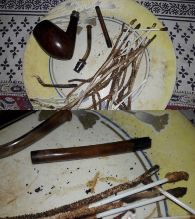 I cleaned the internals of the shank, shank extension and the stem using hard bristled and regular pipe cleaners, q-tips, shank brushes, all generously dipped in isopropyl alcohol. I had never used such drastic measures like initially cleaning the bone shank extension by carefully inserting a round needle file for creating an opening through which pipe cleaners could pass through for subsequent cleaning. The heap of pipe cleaners and q-tips that are seen in these pictures are just the proverbial tip of the iceberg. I must have gone through an entire packet of 50 of both types of pipe cleaners, in addition to the q-tips and brush cleaning!!!!!