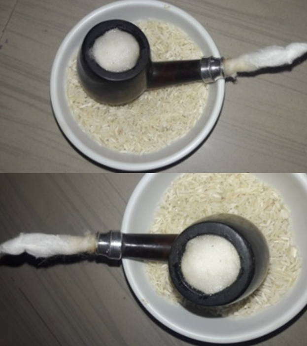 To further deep clean and refresh the internals, I used cotton and alcohol soaks. Using a cotton ball to create a wick, I inserted it through the mortise and into the airway. I then stuffed the bowl with tightly packed cotton balls and placed it in bowl filled with rice grains to provide stability. Similarly I made a tight cotton wick and inserted it through the bone shank extension to further remove all the oils, tars and smells. With a large eye dropper, I then filled the bowl and the bone shank extension with isopropyl 99% until it surfaced over the cotton. I refilled the alcohol in a few minutes after it was absorbed into the cotton balls. I put the stummel and the bone shank extension aside for several hours to soak. After some time, the cotton and the wick were soiled. I discarded the expended cotton and wiped the bowl and the bone shank extension with paper towel. To make sure all was clean, I used a cotton bud and pipe cleaner dipped in isopropyl 99% and they came out clean.