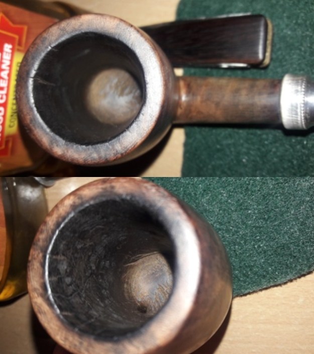 The chamber is no different story!!! There is a thick build up of cake in the chamber. The inner edge of the rim is covered under the thick cake and as such, its condition can be commented upon only after the cake has been scrapped. The outer edge of the rim, however, shows significant damage in the form of dents, dings and deep scratches to the front in 12 o’clock direction. The cause for this damage is….. Oh, forget it, let’s not even go there!!!! The condition of the inner walls of the chamber can be ascertained only after the chamber has been completely reamed devoid of any cake, but I do not foresee any major damages here as the stummel feels solid to the touch and this huge solid piece of briar can sustain some serious damage. You have to feel the stummel in your hand to understand what I am trying to write. It is one heavy and handful of a pipe!!!!