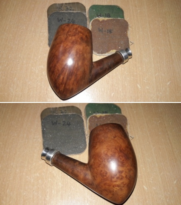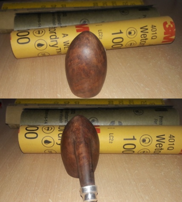 I sand the stummel surface with a 220, 320, 600 and 1000 grit sand paper, in that order, to remove the minor scratches and marks on the rim and stummel surface. I frequently wiped the sanded surface with a moist cloth to remove the briar dust and also to check the progress of my work.