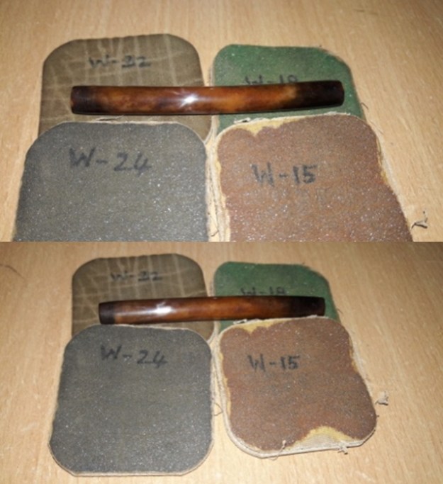 Initially I had decided that I would not be topping the rim top and maintain its original profile. However, in order to ascertain if the crack had migrated through the stummel, I decided to top the rim surface. This would also help to address the numerous dents, dings and scratches on the rim’s top surface and also to remove traces of lava overflow. I topped the rim surface on a 220 grit sand paper. Though it is recommended to have a wooden board with the 220 grit sand paper firmly fixed over it, I just keep the sand paper on a flat table top, holding it firmly with my left hand and rotating the stummel rim top over it with my right hand. I have come to realize that this set up gives me lot more freedom of movement, better control and convenience of storage. Fortunately, it was revealed that the supposed crack was superficial and had not migrated through.