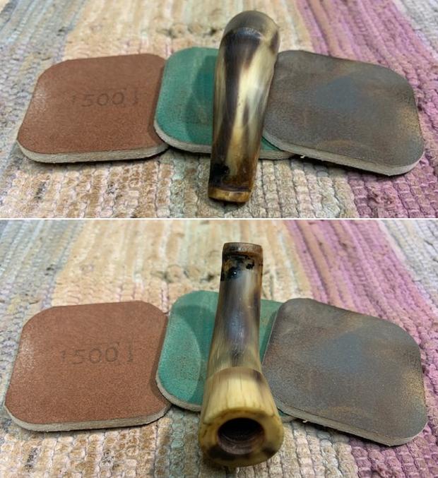 Turning my attention to the horn stem, I cleaned the stem surface, including the worm holes, with q-tips dipped in isopropyl alcohol to remove all the dirt and dust before the fill. I filled the worm hole on the bottom and top surface with clear CA superglue and set it aside to cure. Once the superglue had cured, I sanded the fills with a flat head needle file. To further match the fills with the surface of the stem, I sanded it with 220, 320, 600 and 1000 grit sand paper. I wiped the stem with cotton pad dipped in alcohol to remove the resultant dust. I rubbed some extra virgin olive oil in to the stem and set it aside to be absorbed in to stem. A few minutes later, I polished the stem and also the bone shank extension with micromesh pads, wet sanding with 1500 to 2400 grit pads and dry sanding with 3200 to 12000. I rubbed a little extra virgin olive oil in to both after every three pads. The stem is now nice, smooth and shiny while the extension though smooth and shiny, still had the golden brownish hues of the tobacco oils and tars. I was wondering as to next course of action, Mr. David Goostree, an experienced member from The Tobacco Pipe Restorer group on FB, provided valuable information that the bone is similar to a Meer and absorbs oils from the tobacco and colours just like a meerschaum. Another issue taken care of!!!