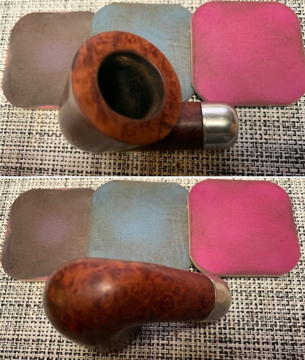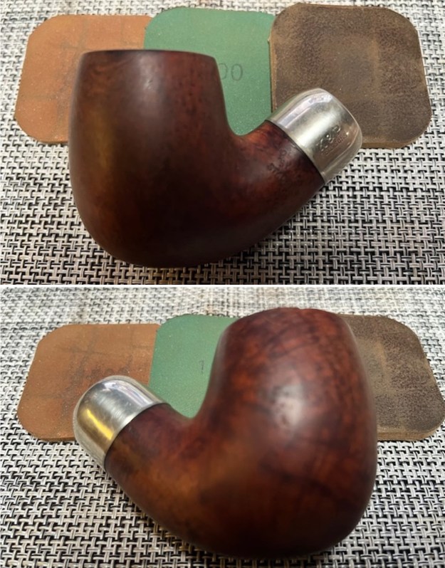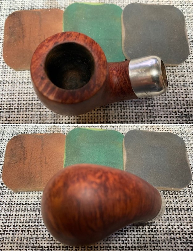 I sanded the briar with 320-3500 grit 2×2 inch sanding pads to remove the remainder of the varnish coat that the acetone did not remove. I wiped the bowl down with a damp cloth after each sanding pad to remove the sanding debris. It really looks much better.