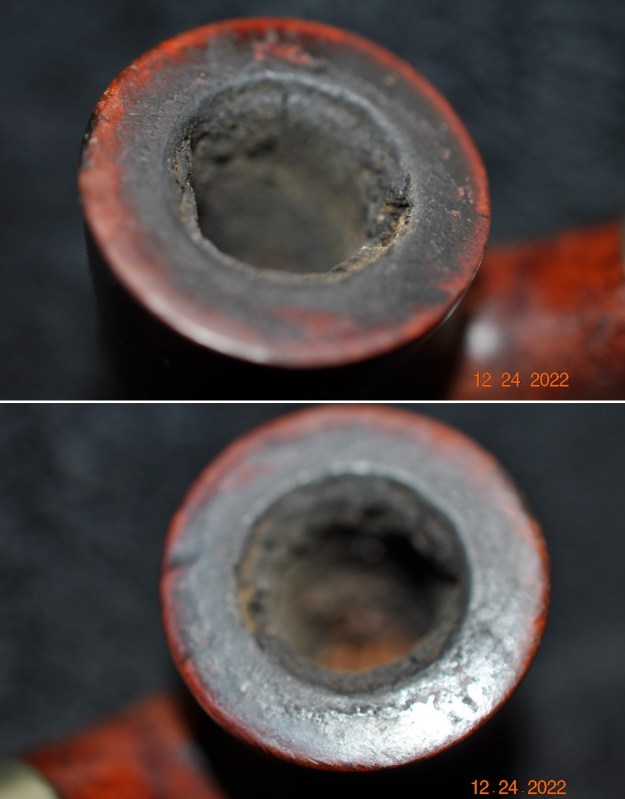 Jeff took photos of the bowl and rim top to show the cake in the bowl and the lava build up on the top of the rim and the edges of the bowl. The rim top looked pretty good. Jeff took photos of the top and underside of the stem showing the tooth chatter, calcification and oxidation on the stem surface and wear on the edges of the button.