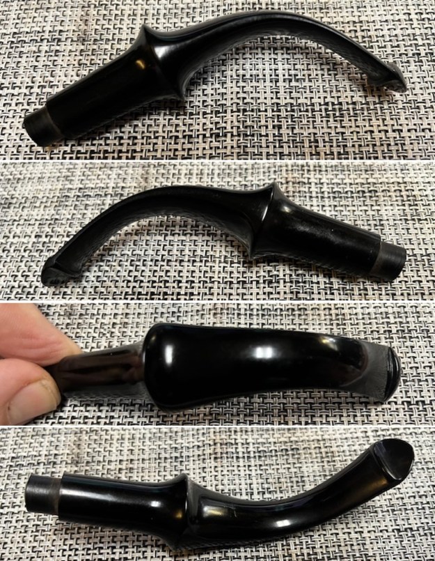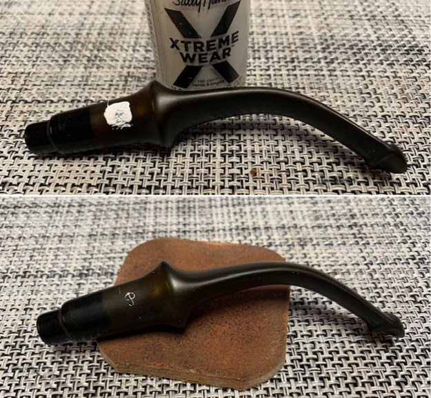 Jeff had cleaned it thoroughly. He had reamed it with a PipNet reamer and cleaned that up with a Savinelli Fitsall Pipe Knife. He had scrubbed the exterior of the briar with undiluted Murphy’s Oil Soap. He removed the shiny coat on the briar with acetone on cotton pads. He cleaned out the interior of the shank, sump and airway in the shank and stem with alcohol, pipe cleaners and cotton swabs. He scrubbed the stem with Soft Scrub to remove the oxidation and calcification on the surface. He soaked it in Briarville’s Pipe Stem Deoxidizer to remove the oxidation. He removed it from the Deoxidizer and rinsed it off with warm water. I took some photos of the pipe before I started my part of the work (sadly I forgot to take photos until after I had rubbed the bowl down with Before & After Restoration Balm. But you can see the idea.