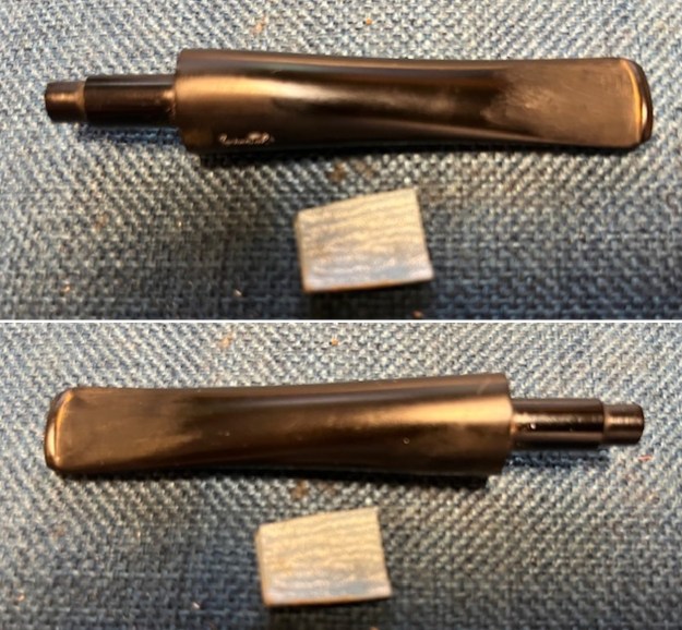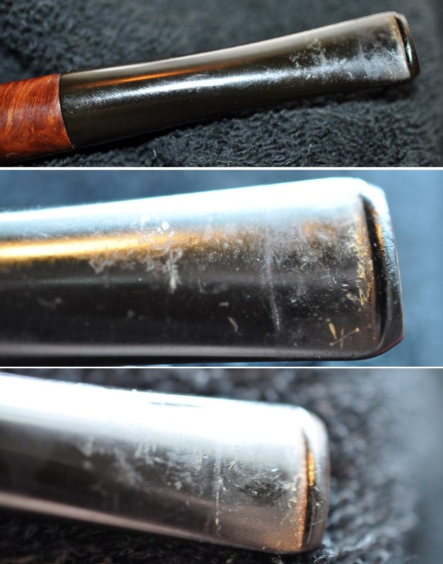 I “painted” the surface of the stem with the flame of a lighter. I was able to raise all of the tooth marks. I sanded out the light remnants that remained with a folded piece of 220 grit sandpaper. Once finished I wiped it down with an Obsidian Oil impregnated cloth. It looked much better.