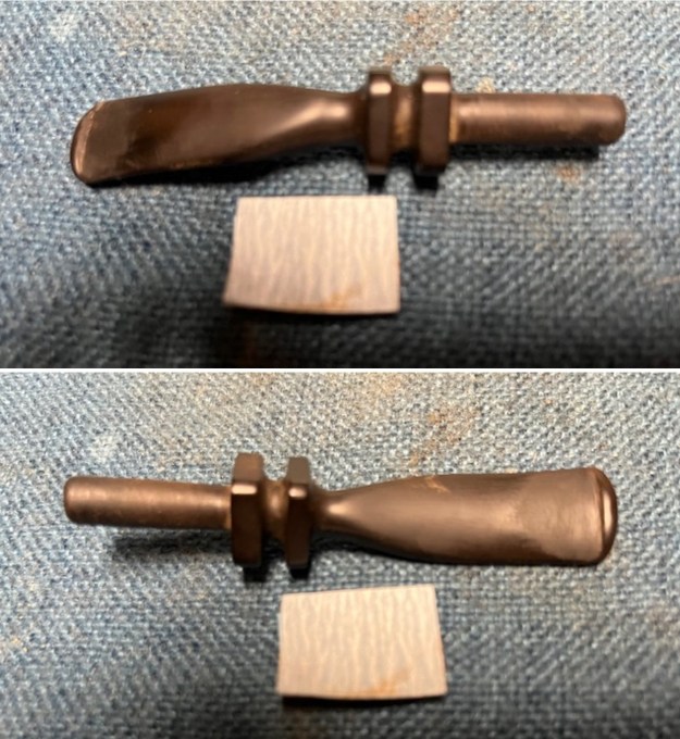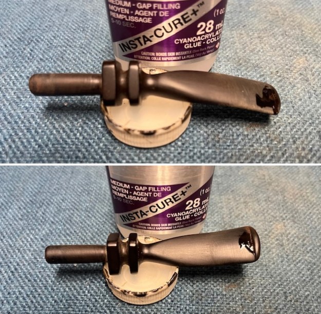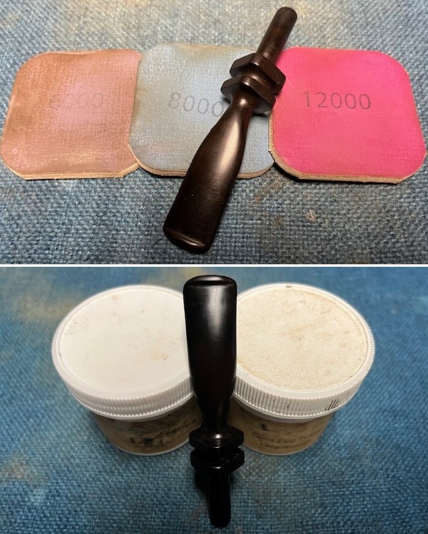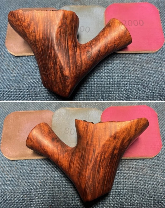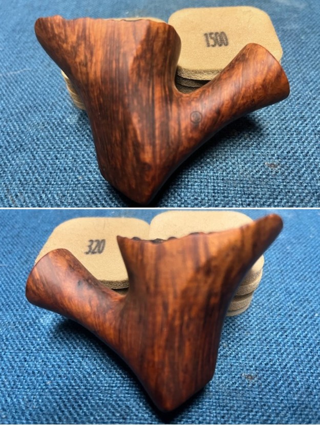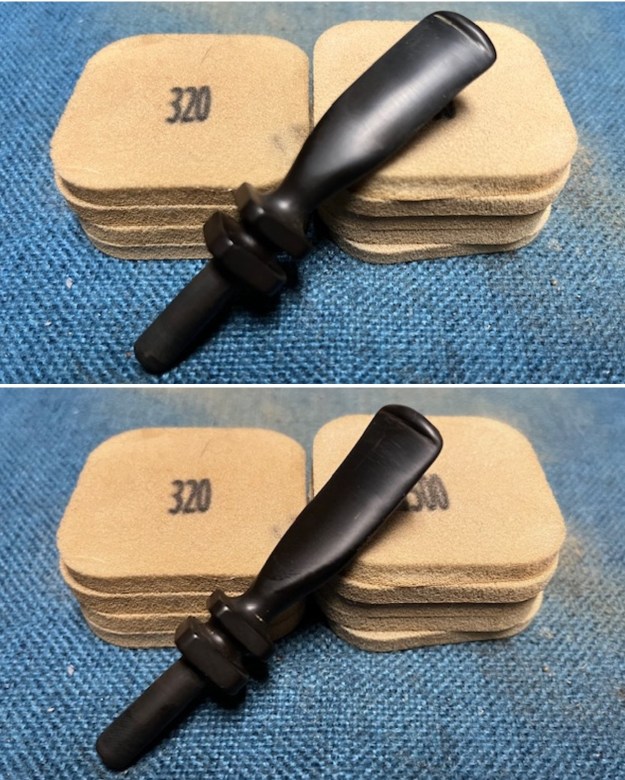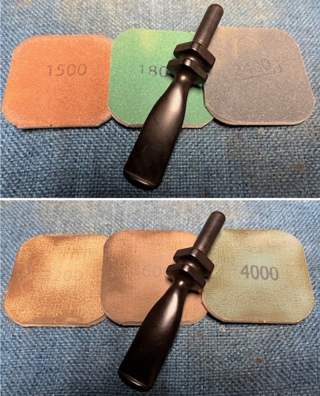 I sanded the stem and tenon surface with 320-3500 grit 2×2 inch pads. I wiped the stem down with an Obsidian Oil cloth after each sanding pad.