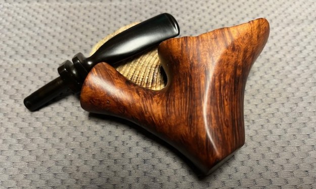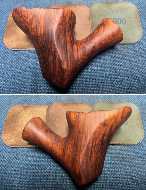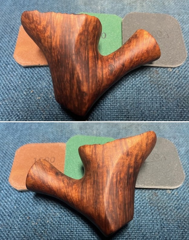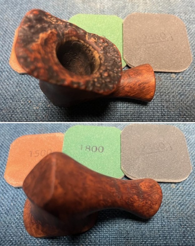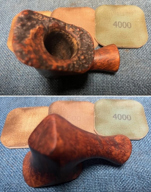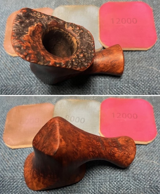 I polished the vulcanite with micromesh sanding pads – 1500-12000 grit pads. I wiped it down with Obsidian Oil after each sanding pad. I used Before & After Pipe Polish – both Fine and Extra Fine to further polish the stem.
