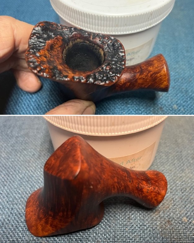 I scrubbed the bowl and shank with a tooth brush and some undiluted Murphy’s Oil Soap. I rinsed it off with warm water to remove the dust and soap from the finish. I dried it off with a soft cloth. The rim top was still darkened in the grooves of the sandblast.