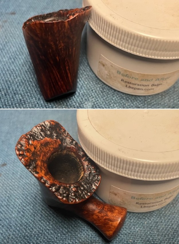 I rubbed the briar down with Before & After Restoration Balm. I worked it into the briar with my fingertips and a horsehair shoe brush to work it into the nooks and crannies of the sandblast finish. The product works to clean, enliven and preserve the briar. I let it sit for 10 minutes then I buffed it with a cotton cloth to deepen the shine. The briar really comes alive with the balm.