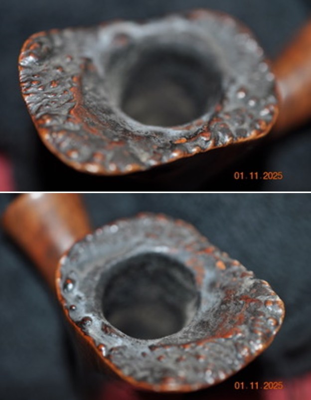 I took photos of the bowl and rim top to show the thickness of the cake and the lava coat on the rim top. There was some tobacco debris in the bottom of the bowl. The stem photos show the condition of the taper stem ahead of the button.