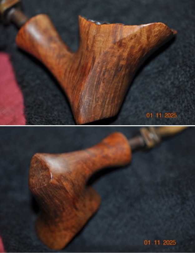 Now it was time to work on the pipe. I started my work by reaming the pipe. I scraped out the light cake with a Savinelli Fitsall Pipe Knife. I took the cake back to bare briar. I sanded the walls smooth with 220 grit sandpaper wrapped around a piece of dowel. The bowl walls looked very good with no burn damage or checking on the walls.