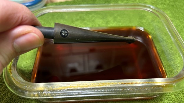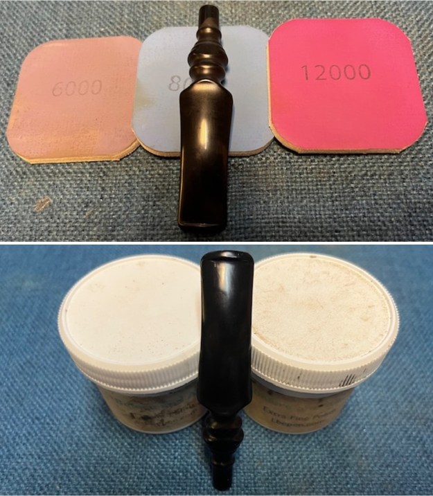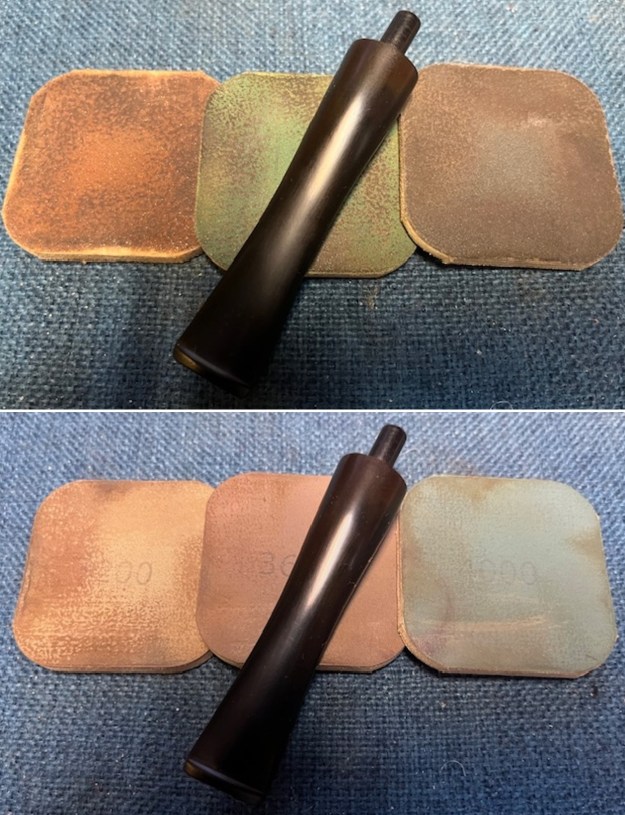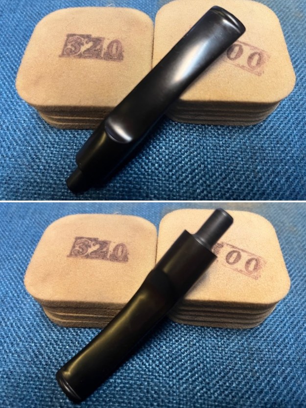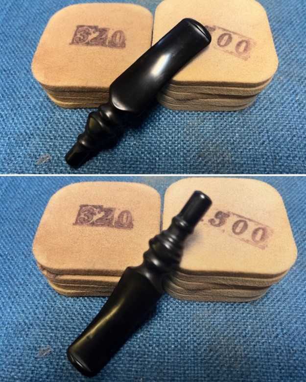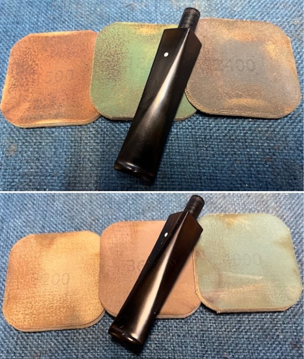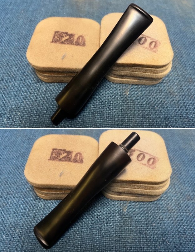 I sanded the stem further with 320-3500 grit 2 x 2 inch sanding pads. I wiped the stem down after each pad with some Obsidian Oil. It began to take on a rich look.