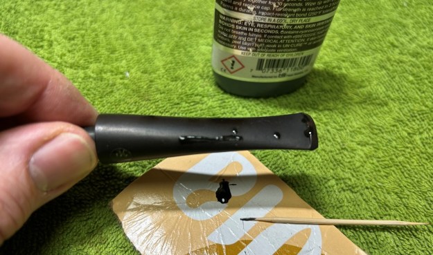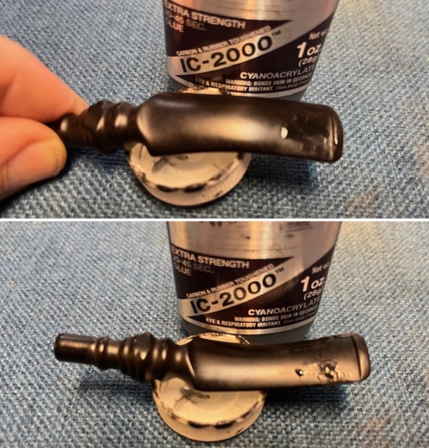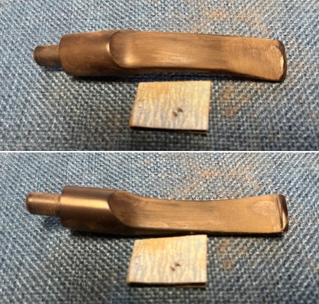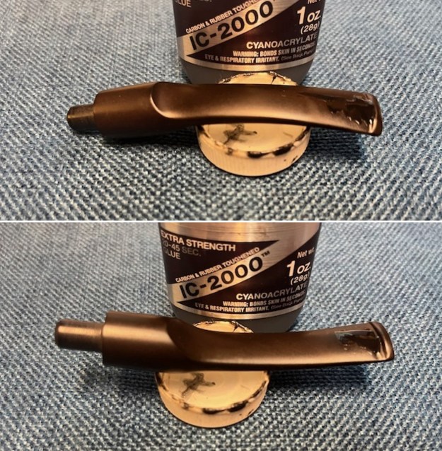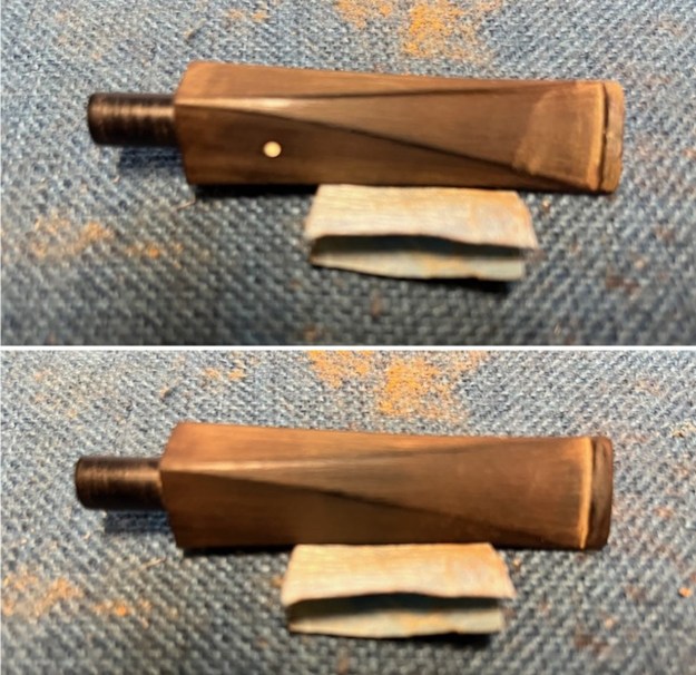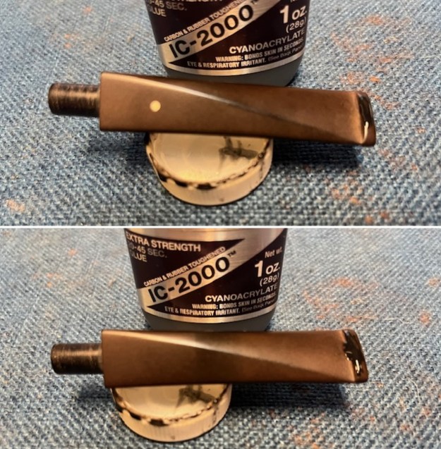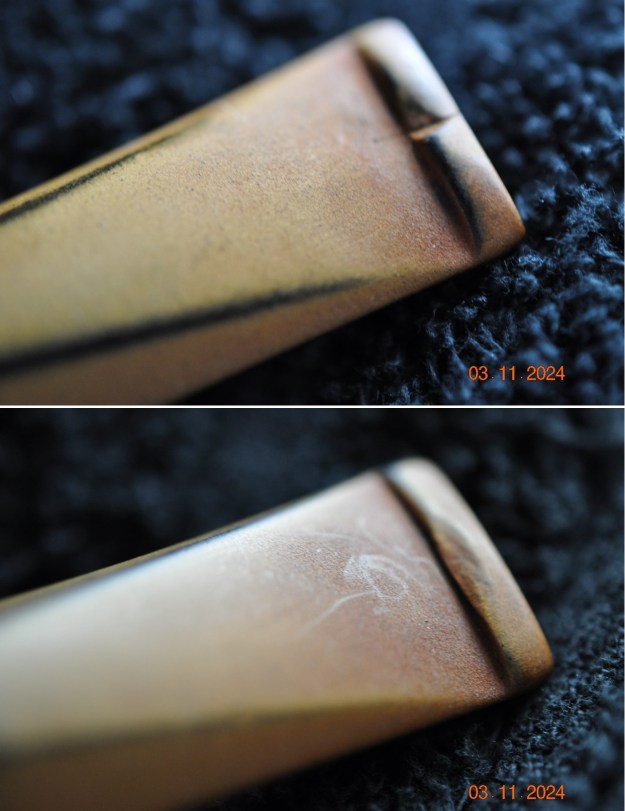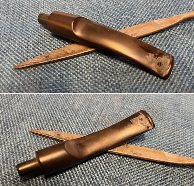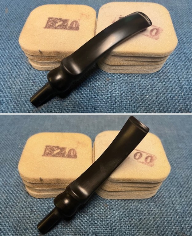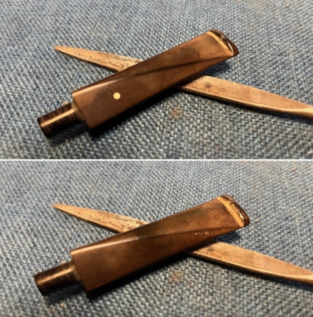 I set the bowl aside and worked on the stem at this point in the process. The tooth chatter had a couple of deeper marks on the underside that would not lift with heat. I cleaned the areas and filled in the spots with some clear CA glue. Once it cured I used the file to flatten the repair and sanded it with a piece of 220 grit sandpaper.