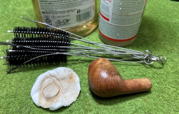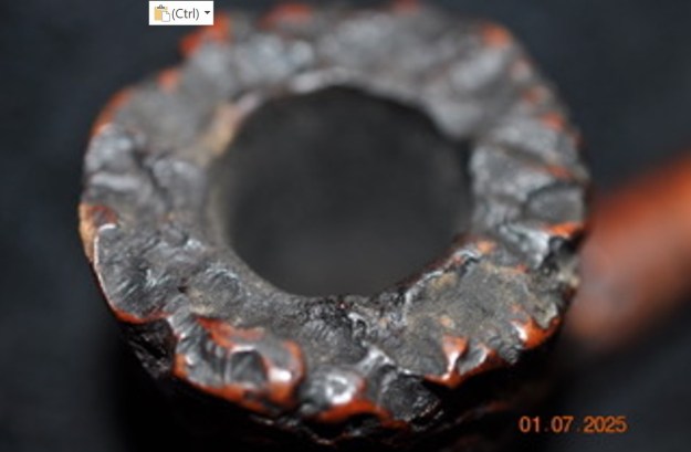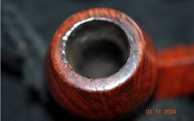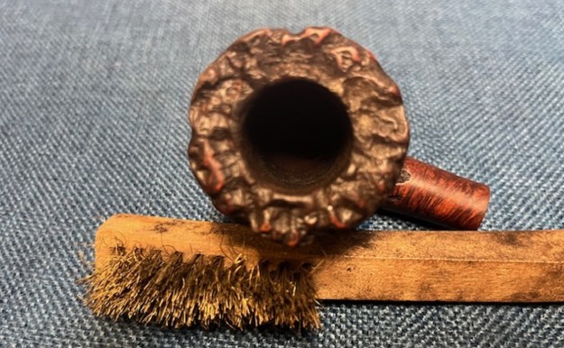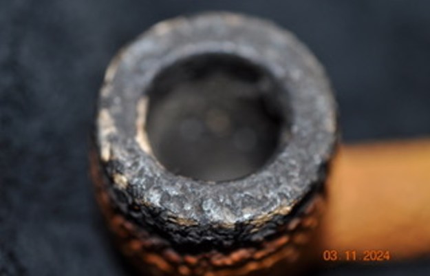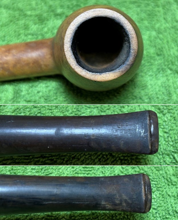 Armed with the information on the F stamp being added at a later time I knew a bit about the pipe at hand though there were no solid dates. I turned to address the pipe itself. Jeff cleaned up the pipe for me. He reamed the bowl with a PipNet pipe reamer and cleaned it up with a Savinelli Fitsall Pipe Knife. He scrubbed the exterior with Murphy’s Oil Soap and a tooth brush to clean off the grime off the finish and the heavy overflow of lava on the rim top. He cleaned up the internals of the shank, mortise and stem with pipe cleaners, cotton swabs and alcohol to remove all of the oils and tars in the pipe. He soaked the stem in Briarville’s Pipe Stem Deoxidizer and was able to remove much of the oxidation. When it arrived here in Vancouver it was a clean pipe and I knew what I had to work with. I took photos of it before I started my part of the restoration.