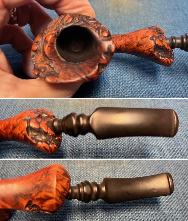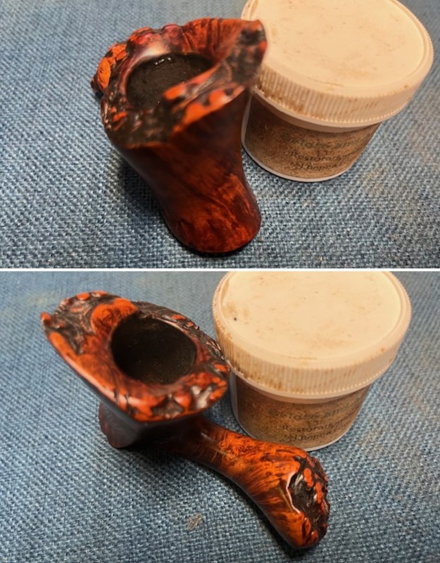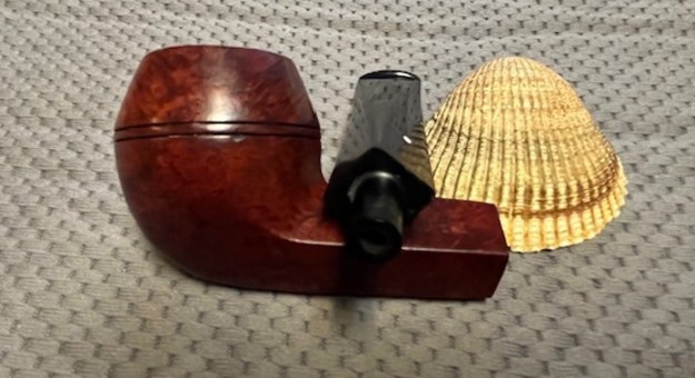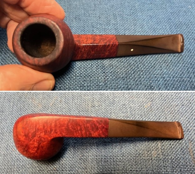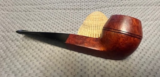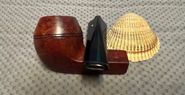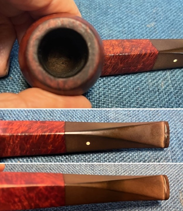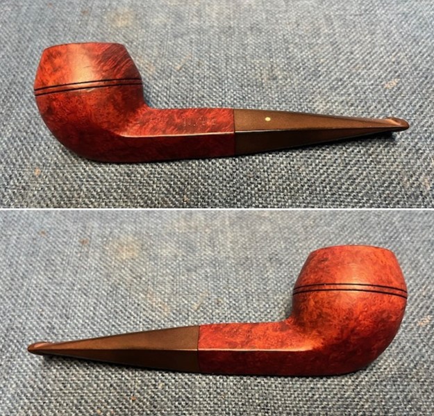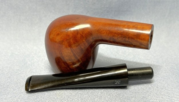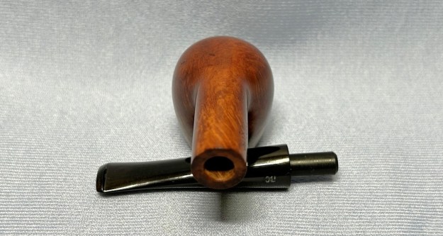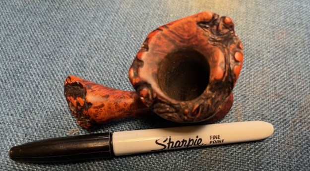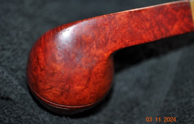 I took a photo to try and capture the stamping on the shank side. It was faint but readable. I also removed the stem and took a photo of the pipe sans stem to show the proportions of this unique beauty. There also appears to be a small flaw/crack just below the NM of Danmark. I will need to check that out.